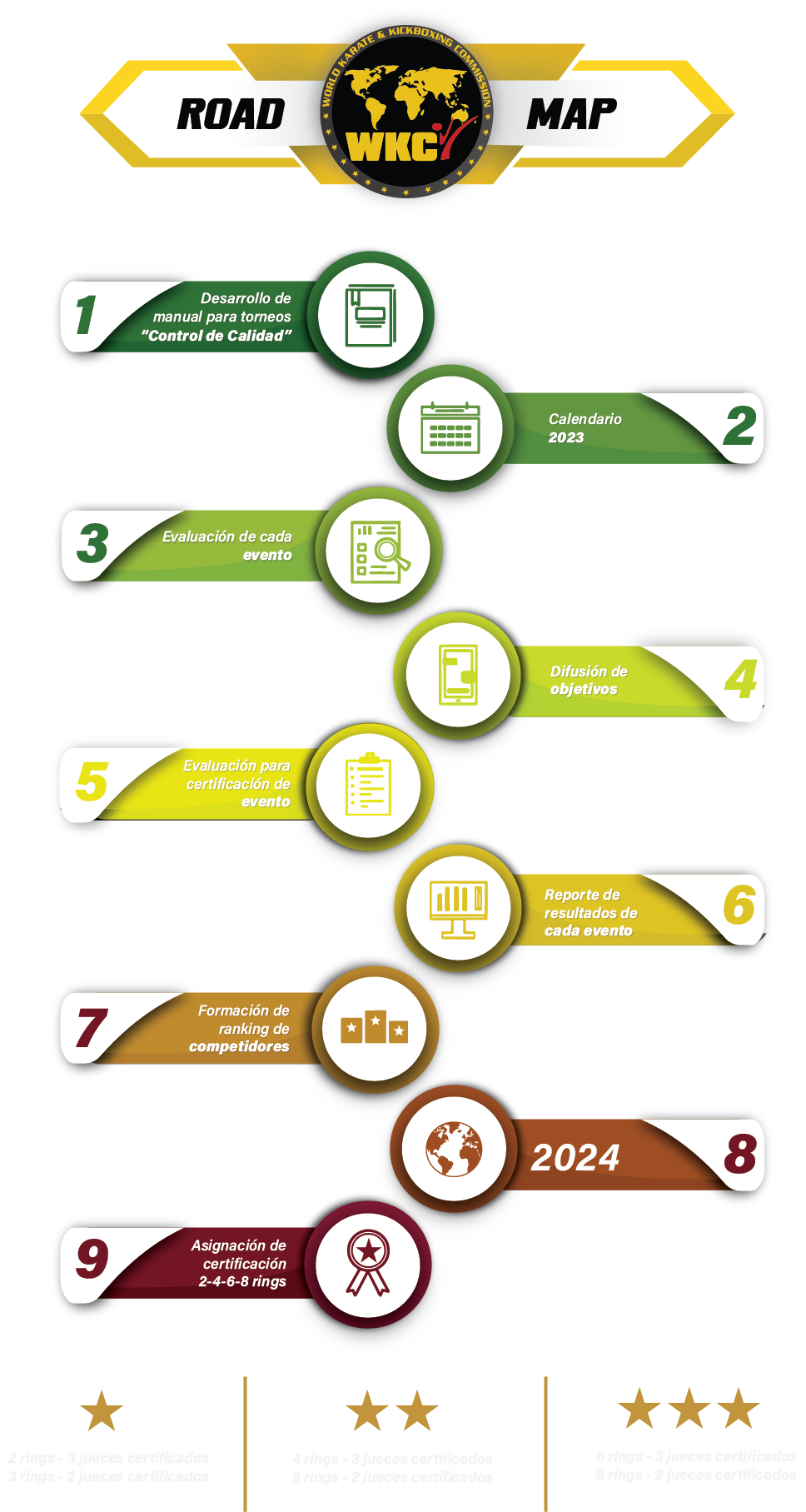 Ayudar a tener mejores torneos en: nivel competitivo, vivir experiencias inolvidables y justas para una mejor convivencia familiar, que tengan un ambiente seguro y con justicia arbitral para la cual se capacita a los jueces constantemente. Así como evaluar cada torneo para que en 2024 todos los torneos WKC tengan un indicativo que garantice jueces certificados por ring de cintas negras, mismas divisiones siempre para tener un ranking nacional y una buena calidad en sedes y premiación.